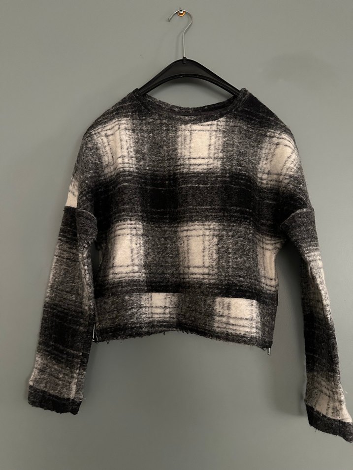 Kadınlar için #mango gri kareli, örgü yün kazak. Uzun kollu, crew yaka ve rahat kesimli, günlük kullanıma uygun sıcak bir parça. Bedeni m ancak s beden kullandı.