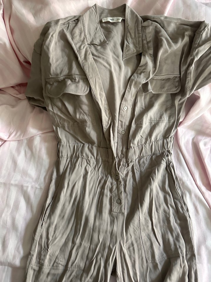 Mango keten kumaştan, kısa kollu, yakalı ve düğmeli kadın tulumu. Rahat kesimli ve midi boyda, sokak modasına uygun.