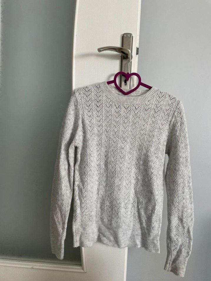 Gri örgü kadın kazak, uzun kollu ve yuvarlak yakalıdır. Rahat, bol kesim ve normal boydadır, günlük kullanıma uygundur.