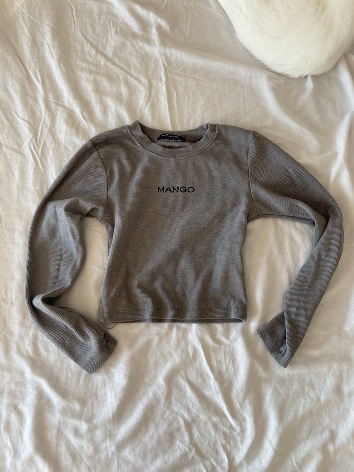 Mango marka, uzun kollu, bisiklet yaka, baskılı gri keten kumaştan, dar kesim kadın crop