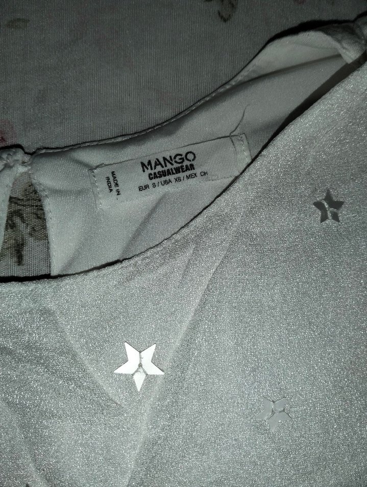 Mango markalı, gri renkli, kısa kollu, V yaka, düğmeli, baskılı ve sentetik kumaştan yapılmış rahat kesim kadın bluz. Outdoor kullanıma uygundur.