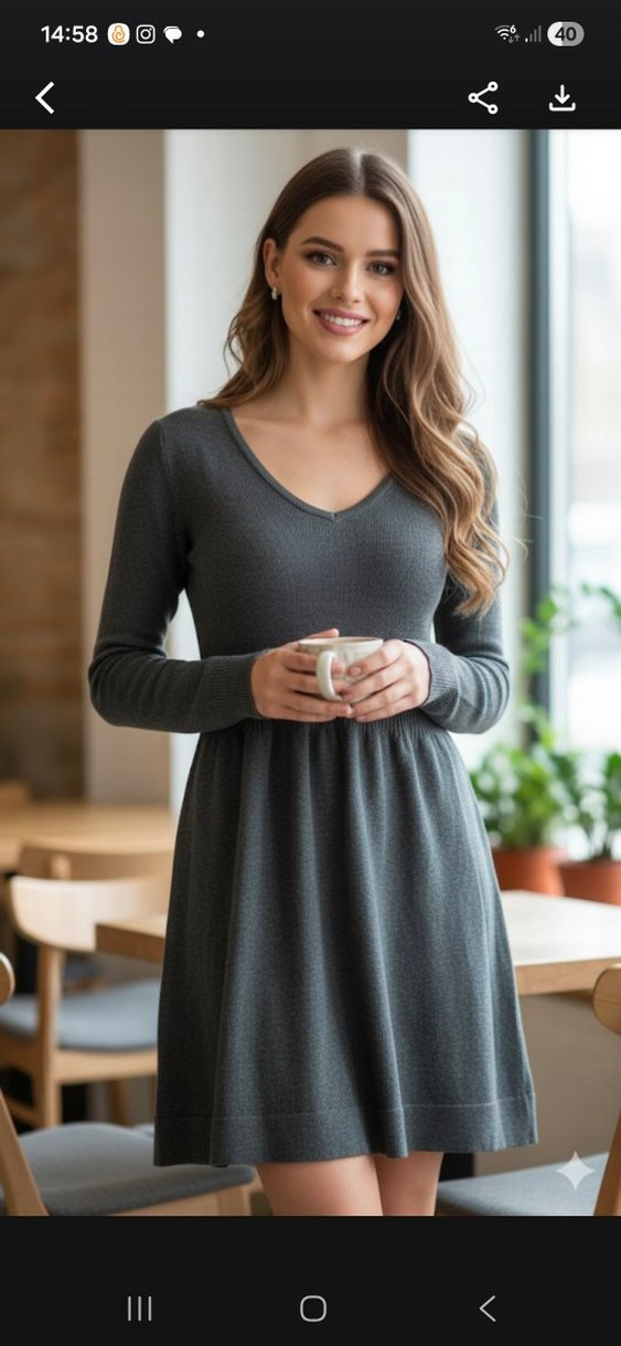 Gri triko elbise, V yaka ve uzun kolludur. Salaş kesimi ve midi boyu ile günlük kullanıma uygundur. Desensiz, sade tasarıma sahiptir. S beden