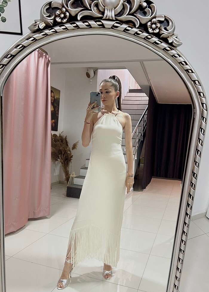 Uzun model püskül detaylı elbise. Sırt açık sütyensiz kullanıma uygun. İç astar mevcut ancak açık renk olduğu için iç gösteriyor uygun çamaşırla kullanılır. Bel daraltma yapıldı başka işlem yapılmadı. 1 kere giyidi temiz deformesiz. Ekrü renktir.