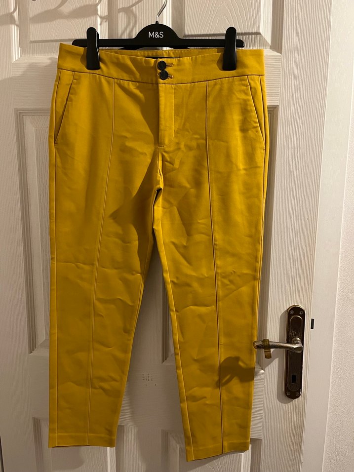 Hardal kadın kumaş pantolon, normal boy ve rahat kesime sahip. Düğmeli, ofis kullanımı için uygun.