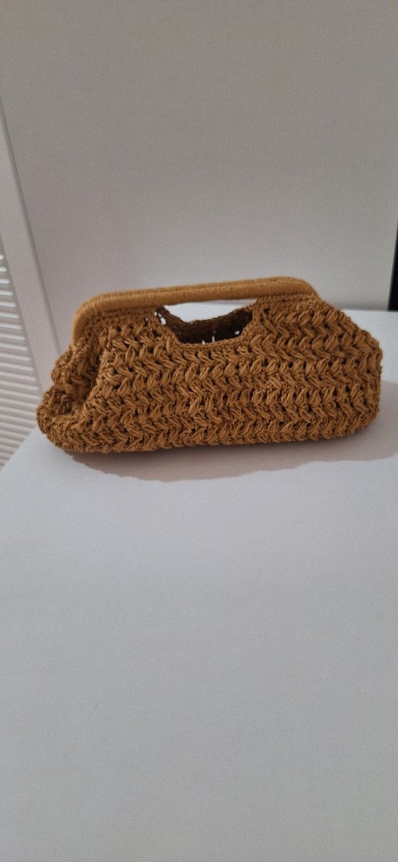 Örgü dokulu, açık kahverengi kadın clutch çanta. Bohem tarzı ve günlük kullanıma uygun, desensiz ve rahat tasarım. Mango muadili.Astarsız.