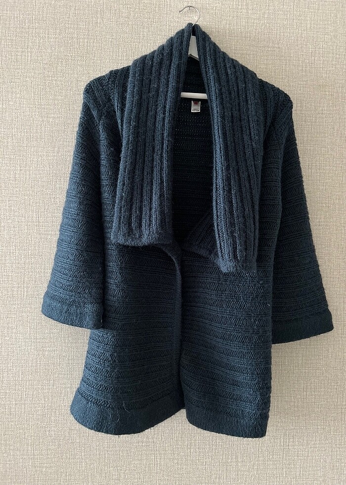 Petrol mavisi uzun hırka. Bedeni L ancak salaş bir hırka olarak daha küçük bedenlere de olur. Kombin yapamadığım için hiç giymedim, 1 kere aldığımda yıkadım