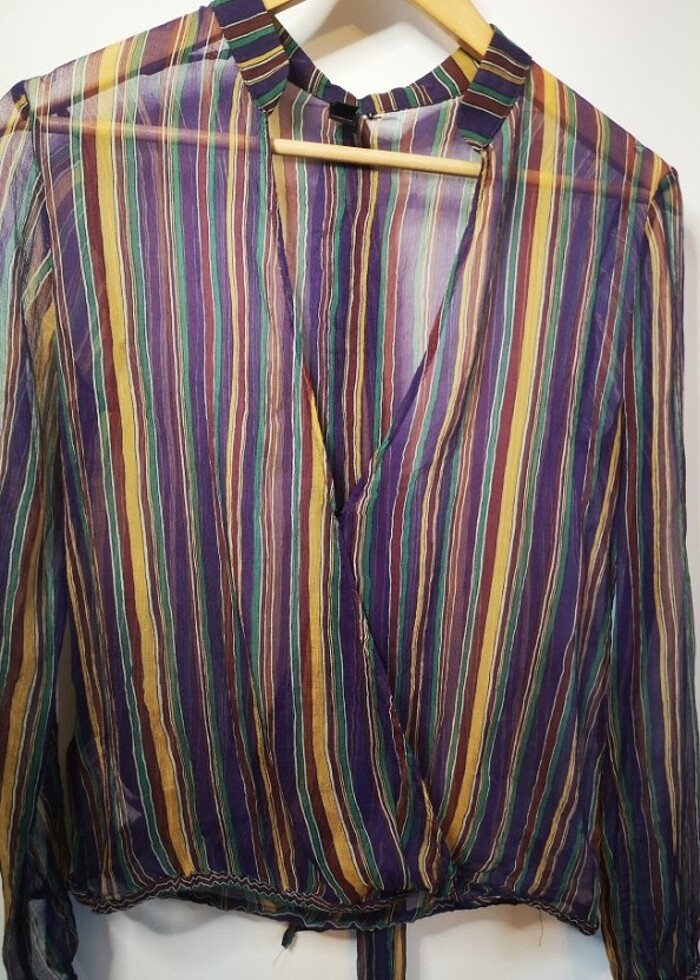 Mor çizgili, yüzde yüz ipek kumaş. M beden, çok şık, mor, sarı, yeşil tonlarda. Ön kruvaze yaka, çıtçıtlı. Kol ve etek ucu hafif lastikli. Gece ve gündüz kullanılabilir. Boy 56, iki koltuk arası 42, kol boy 60 cm. Yakada ince bir fular var ancak istenirse çıkabilir şekilde takılmış. Hakim yaka.
