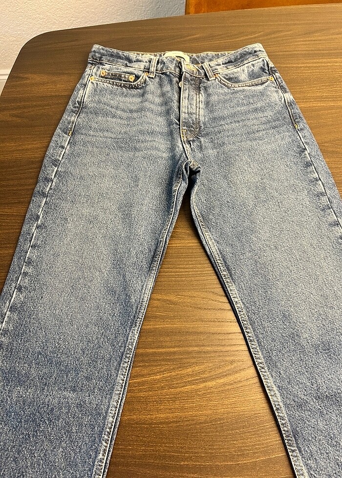 Paçaları kendinden kesiktir.Boyu belden 93 cmdir. Düğmeli yüksek bel jean