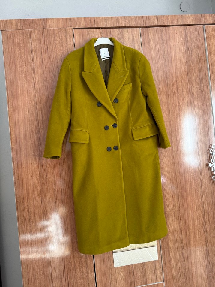 Çift düğmeli, klasik yaka ve ön cep detaylarına sahip uzun yeşil kaban. Yapısal kesimi ve sıcak tutan dokusuyla dikkat çeker.