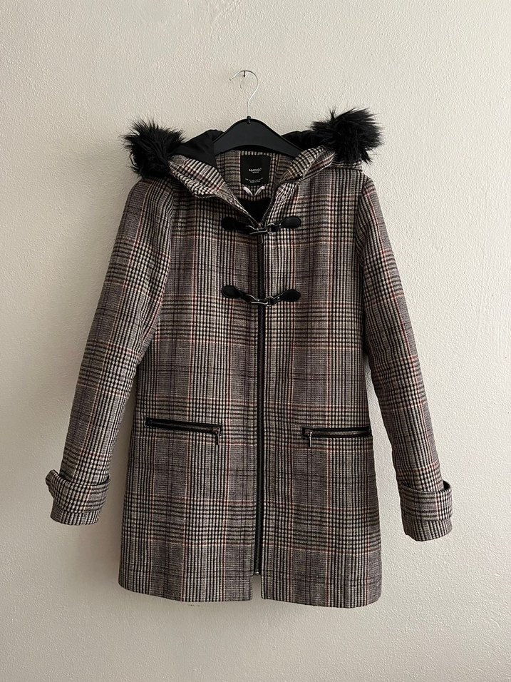 Gri ekose desenli kaban, kürk detaylı kapüşon ve kesik yaka ile dikkat çeker. Yumuşak yünden yapılmış, midi boy ve rahat kesimlidir. Günlük kullanıma uygundur. 34 bedene uygun orijinal sorunsuz mango mont