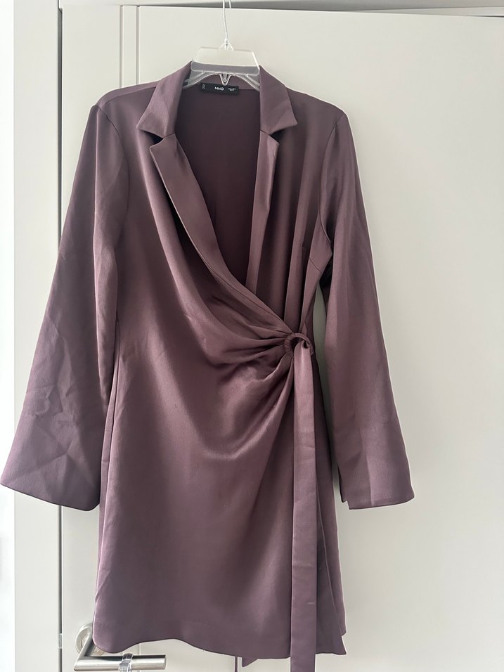 Mango ladın acı kahve renkli, uzun kollu, kol yırtmaç detaylı midi boy, bele oturan iş elbisesi. Modern ve yan bağlama detayı ile sade ve şık görünüme sahip. Gece kullanımı içinde uygun ipek görünümlü pamuklu . Belden bağlamalı ayarlanabilir ceket elbisw