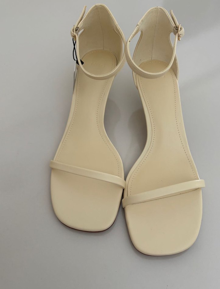 Mango kadın bantlı ayakkabı. Pastel sarı (krem renk ). 42 numara. Bilekten tokalı kapanış. Küçük topuklu. 5.5 cm topuk. Bant tasarımlı. Kare uçlu. Ön açıklık. Orijinal hiç kullanılmamış yeni ve etiketli ürün.