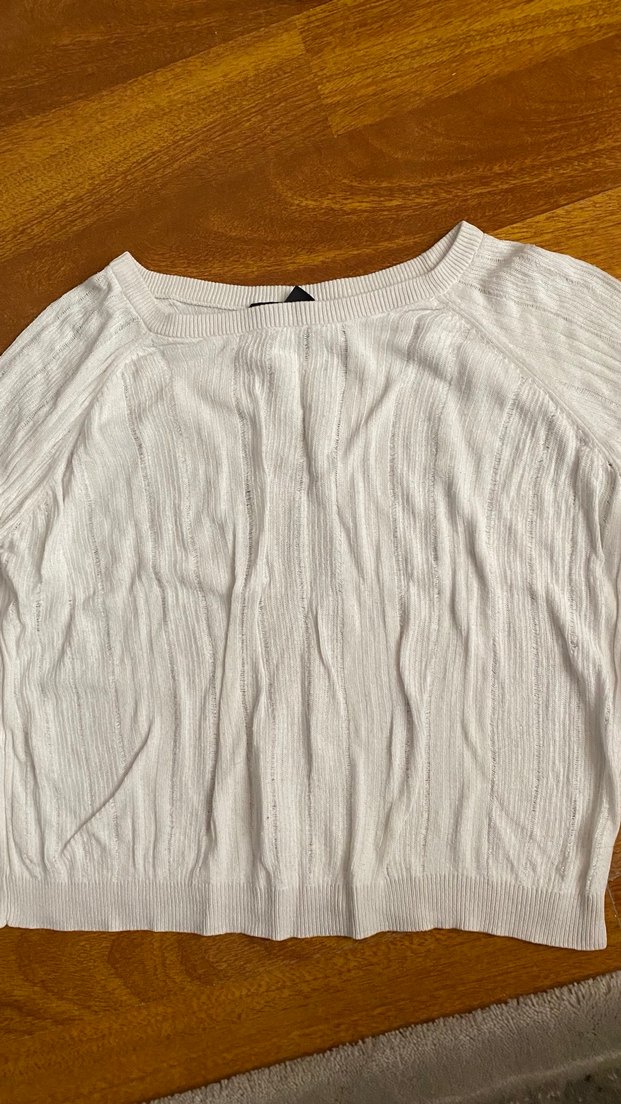 Kadınlar için, beyaz renkte, tek renkli kayık yaka ve uzun kollu rahat kesim midi uzunluğunda triko bluz. Minimalist ve bohem tarzda günlük kullanıma uygun. Çok az düzeyde tüylenme dışında hiçbir sorun yok
