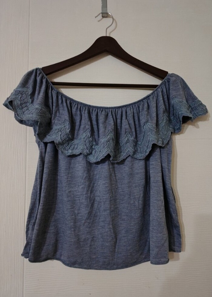 Birkaç kere giyildi. Efil Efil bluz . Omzu açık da giyilebilir . İade yoktur. S beden fakat m ye de olur diye düşünüyorum. Grimsi mavimsi bir renk.