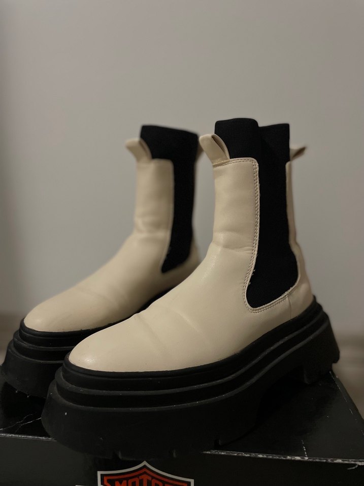Beyaz deri kalın topuklu kadın bot Günlük kullanıma uygundur. Herhangi bir hasarı yoktur iade almıyorum orjinal üründür.