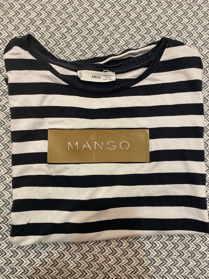 Mango marka, siyah beyaz çizgili, göğsünde altın renkli baskılı logo bulunan kadın tişörtü. Uzun kollu, kayık yaka ve bol kesimdir. Xl diyor ama ben s yi oluyor rahat kumaşı var.
