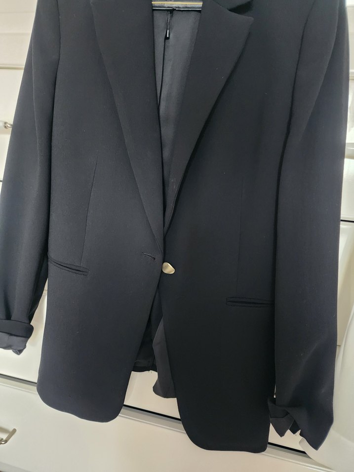 Siyah, düğmeli, satenimsi kumaştan uzun kollu kadın blazer. Ofis için uygun, klasik ve modern kesimli, normal boyda.