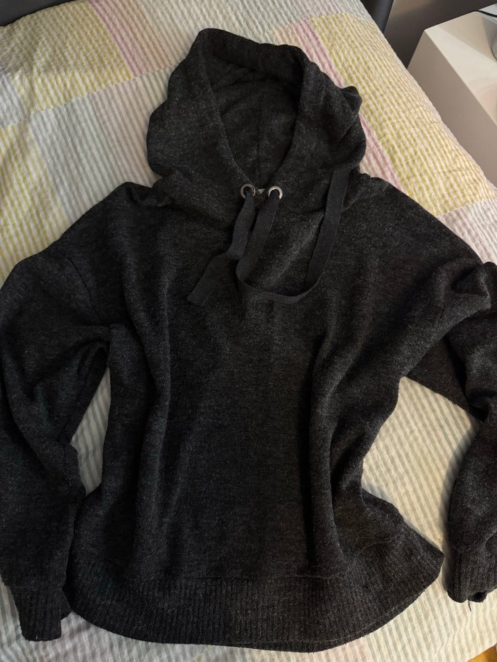 Kadınlar için gri renkte, kapüşonlu ve yüksek yakalı örgü sweatshirt. Uzun kollu, bol kesim ve rahat kullanıma uygun. Defosu yok, sadece iç etiketi kesildi.