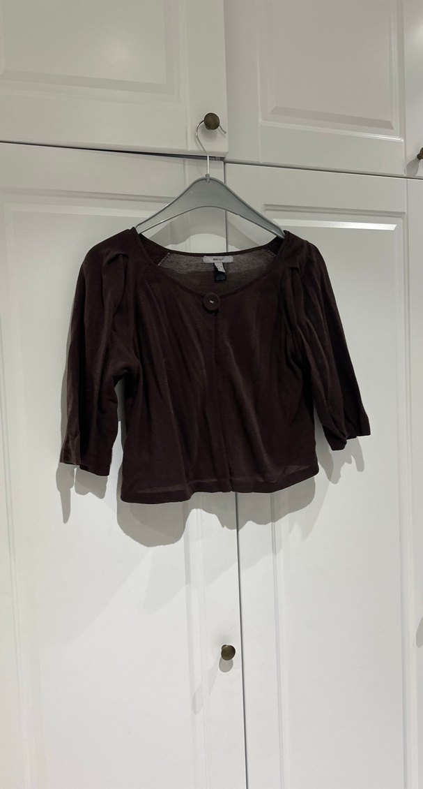 Kahverengi, düğmeli, kadın hırka, gevşek kesim ve bisiklet yaka ile günlük kullanıma uygun minimal goth tarzda. Hiç giyilmedi.