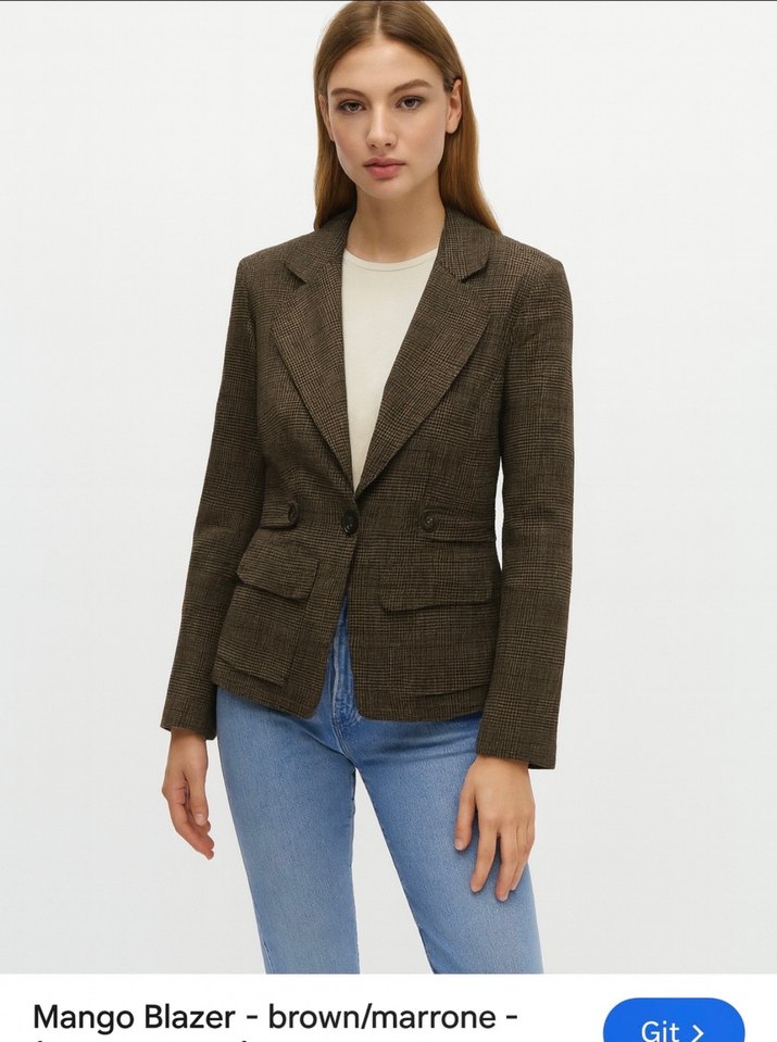 Mango marka, kahverengi, düğmeli, regular fit, uzun kollu ve midi boy keten kumaştan kadın blazer ceket. Ofis ve sokak stiline uygun.