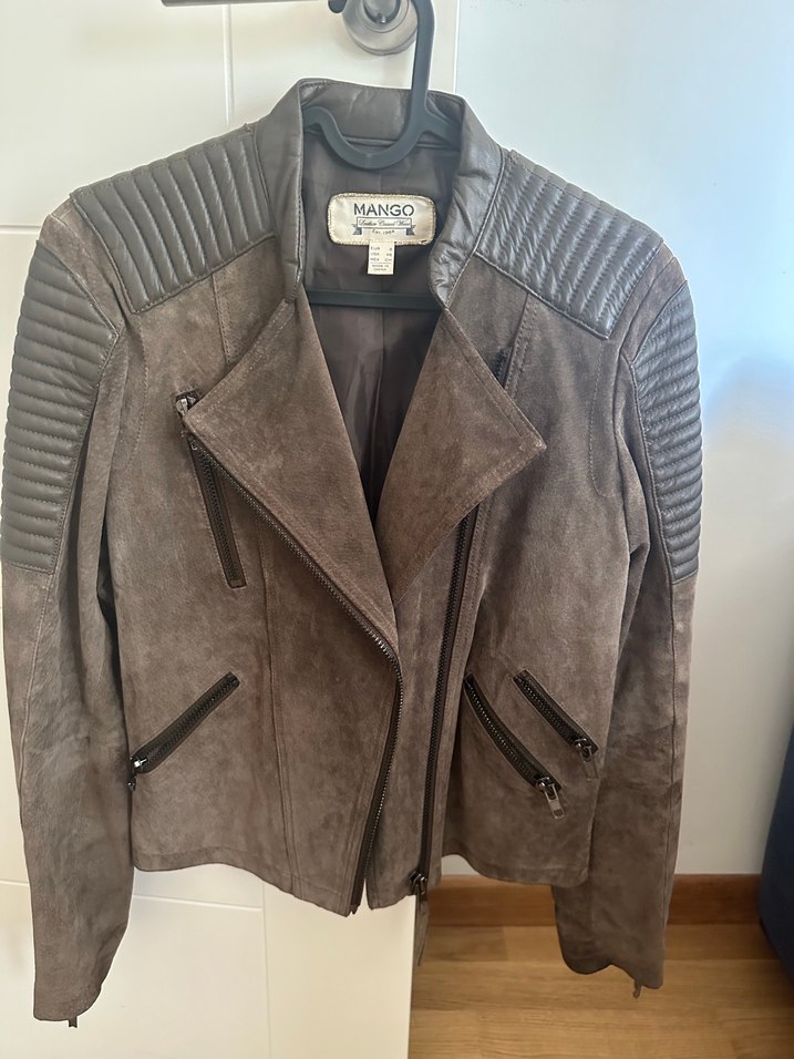 Mango markalı, kahverengi süet biker ceket, fitted kesim, notched lapel yaka ve uzun kolludur. Normal boyda, tokalı ve kapitone omuz detaylarıyla Paris tarzını yansıtır. Omuzdan itibaren 55 cm’dir
