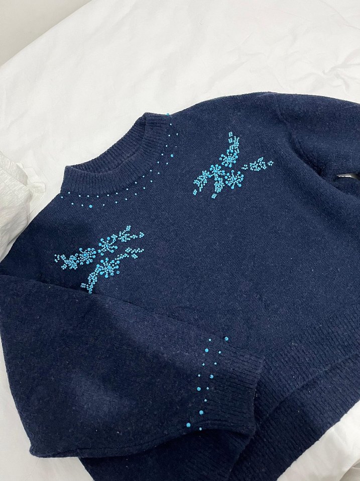 Mavi örgü kumaştan, nakış detaylı, yuvarlak yaka, bol kesim kadın kazak. Günlük kullanım için rahat ve sıcak bir tercih.