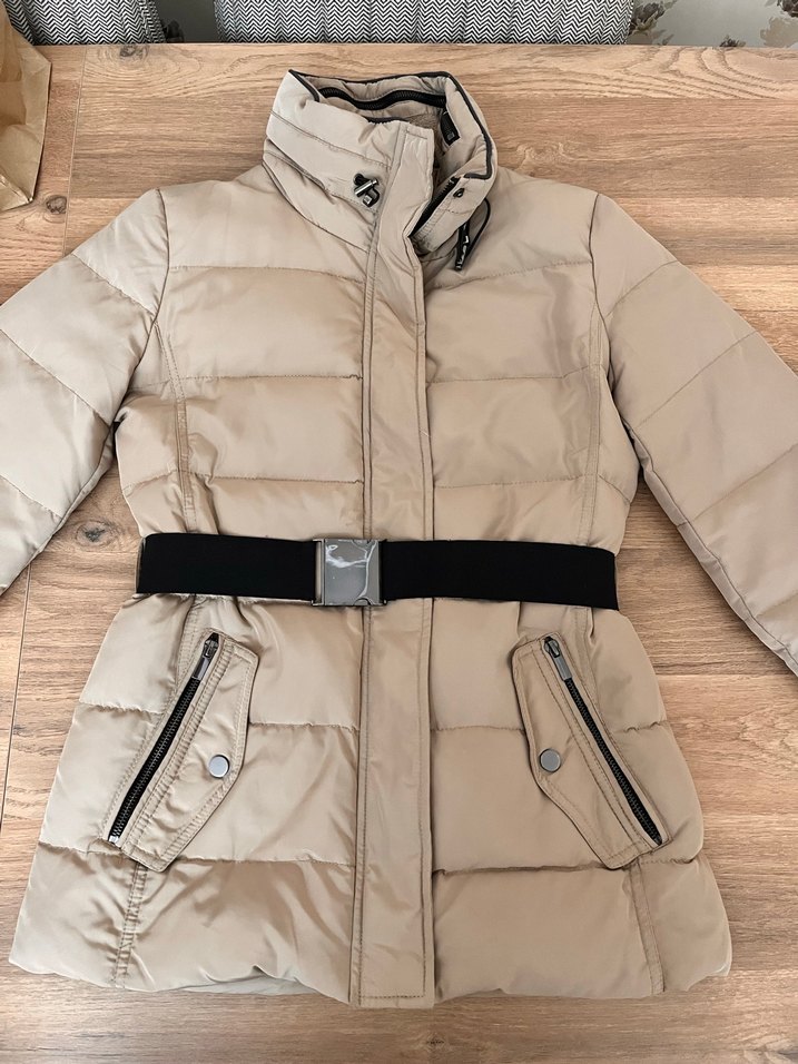 Bej renkte,kemerli çıkartılabilir. Gizli fermuarı var içeriinde yaka kısmında şapkası var hepsini görsellere ekledim