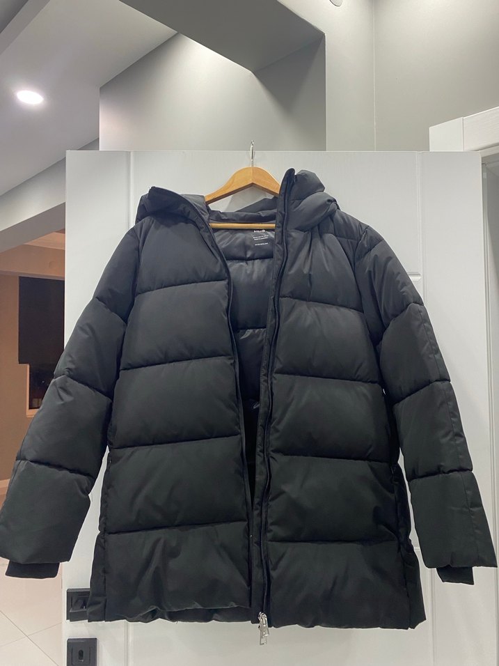 Siyah kışlık mont, kemer detaylı ve fitted kesimlidir. Uzun kollu, yakası notch lapel ve yumuşak fleece kumaştan yapılmıştır. Midi boyda, günlük kullanım için uygundur. ❄️