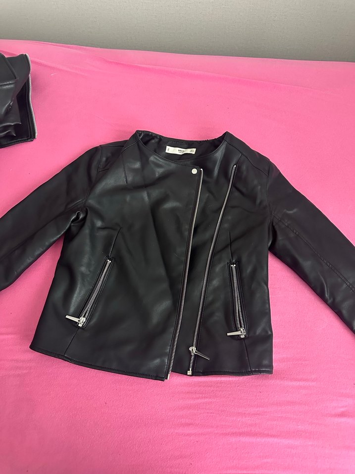 Bu dar kesim siyah deri biker ceket, çıtçıtlı yaka ve fermuarlı ceplere sahiptir. Normal midi boyda, minimalist ve desensiz tasarıma sahiptir, günlük kullanıma uygundur.