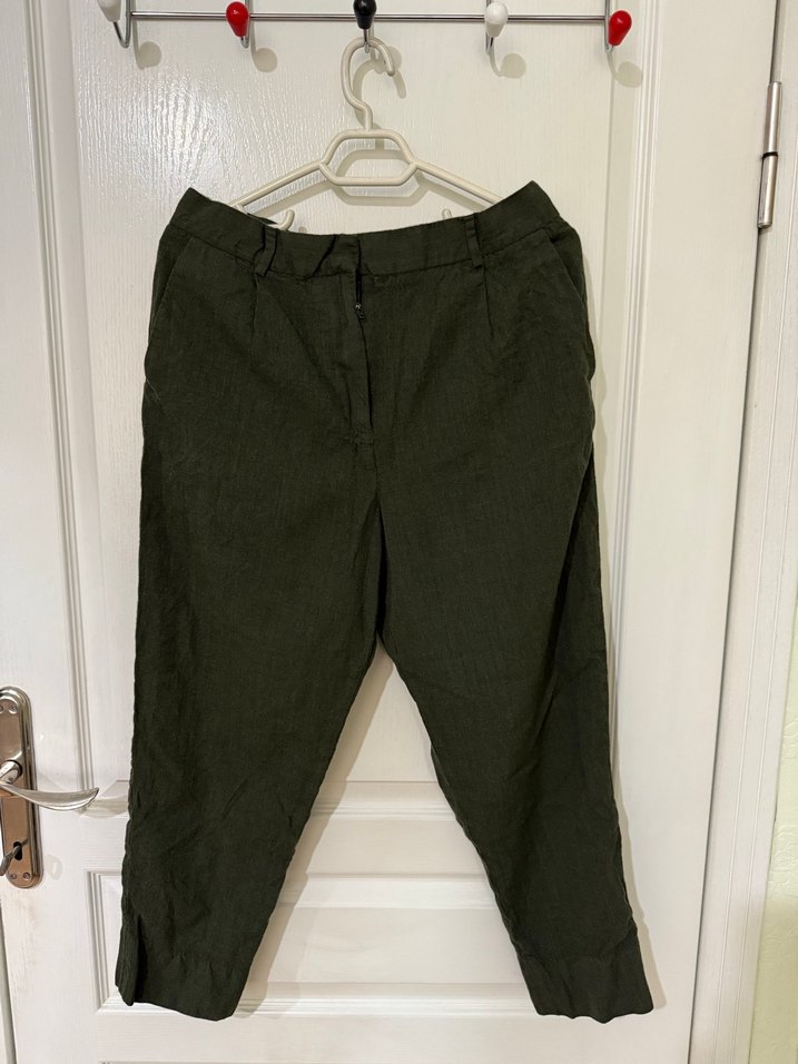 Koyu yeşil keten kumaştan, rahat kesim ve midi boy pantolon. Günlük kullanım için minimal ve desen içermeyen, zahmetsiz şıklık sunar.