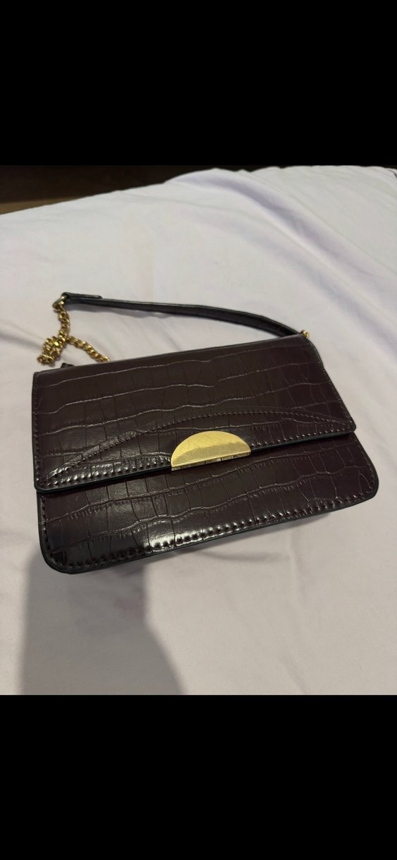 Kahverengi deri kadın çanta, koyu yılan derisi desenli, tokalı altın kapaklıdır. Zincir ve deri askıya sahip modern klasik tarzda, günlük kullanım için uygundur.