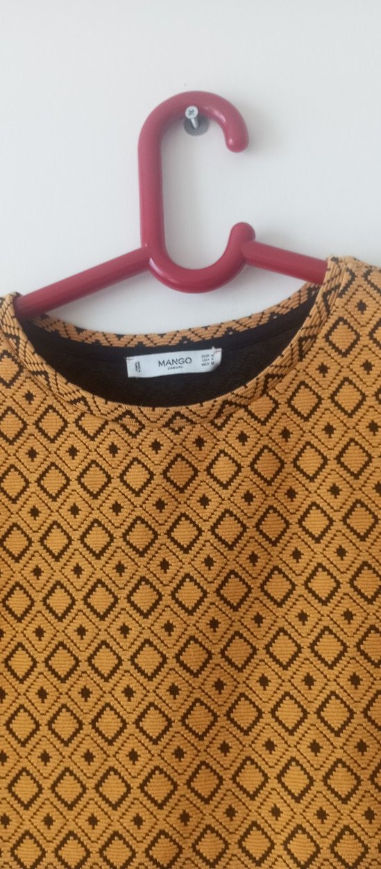 Mango kadın , yuvarlak yaka ve uzun kolludur. otantik desenli, sentetik kumaştan yapılmış, rahat kesim ve normal uzunluktadır.