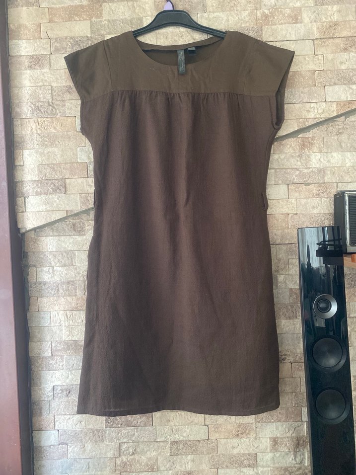 Kahverengi kolsuz keten midi elbise, yuvarlak yakalı ve kemerli. Minimalist, bohem tarzda, normal kesim, günlük ve ofis kullanıma uygun. Bir kez giyildi iadesi yok.