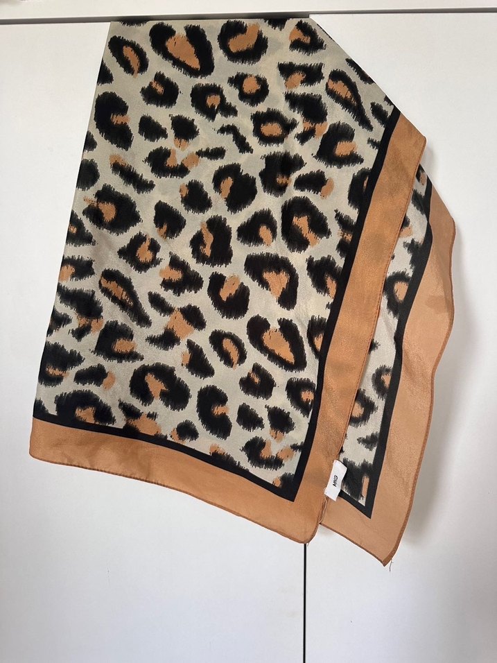 Kahverengi leopar desenli, hafif kumaşlı kadın fular. Siyah bordürlü, çağdaş ve retro Paris tarzını yansıtıyor. Orijinal mango ürünü.