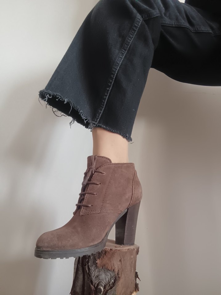 yeni gibi Kahverengi süet, kalın topuklu kadın bot. Bağcıklı ve tokalı detaylarıyla günlük kullanıma uygun, trend bir görünüm sunar.