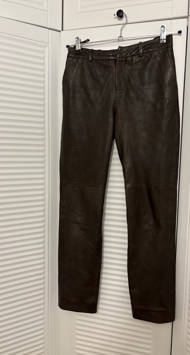 Mango Gerçek Deri Kahverengi deri, regular fit kadın pantolon. Biker tarzı, günlük ve ofis kullanımına uygun.Bel 37 cm ben bacak boyunu içe katlamalı olarak sitiletto ve çizmelerle uzun ve kısa kullanmak için yaptırmadım içe katlamalı boy 96 cm ön çıtçıttan ağ bitimine kadar 29 cm iç kısmın da şort gibi diz kapağına kadar astarı var terletmez deri olduğu için renkte dalgalanmaları var eskitmeli bu sebeple iade kabul etmem
