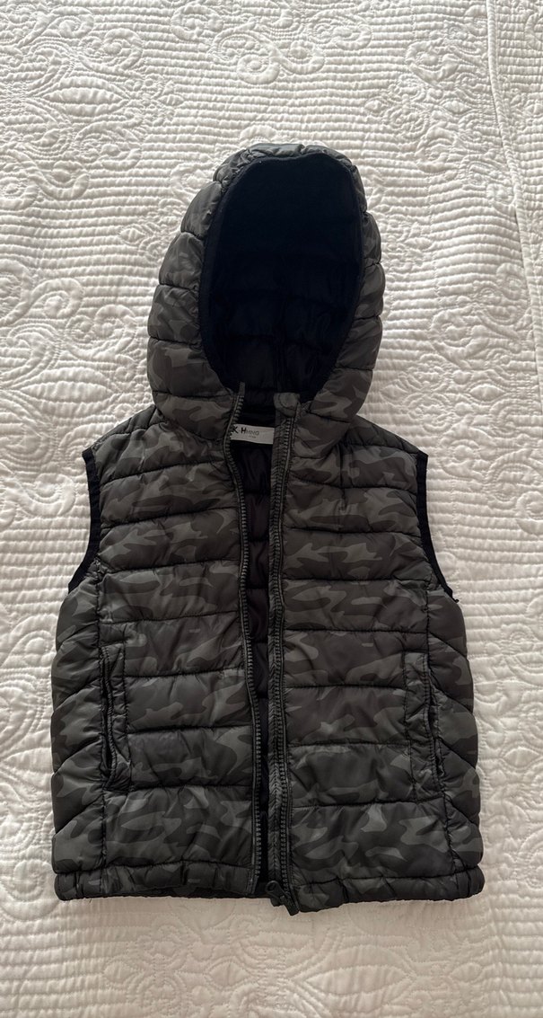 Kapüşonlu, yüksek yakalı ve fermuarlı erkek yeleği. Kamuflaj desenli, ince kesim ve sentetik kumaştan üretilmiştir. Trendy casual tarz için uygundur.