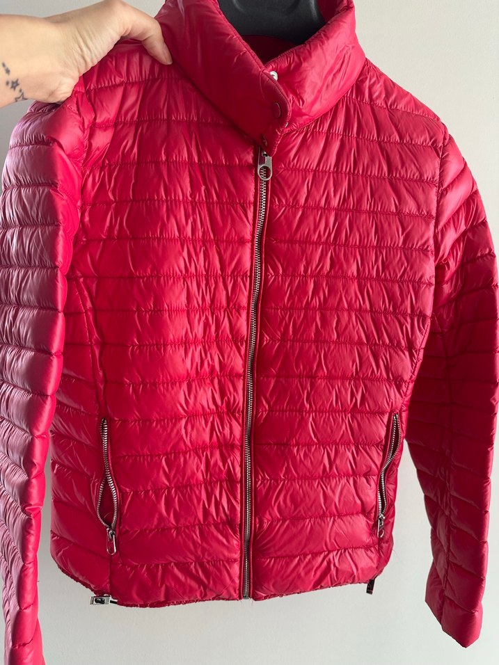 Fermuarlı, yüksek yakalı, kırmızı kadın mont. Yumuşak sentetik kumaştan, sokak stilinde, dış mekan kullanımı için uygun. Kaz tüylüdür kırmızı fuşya arası çok tatlı bir renktir