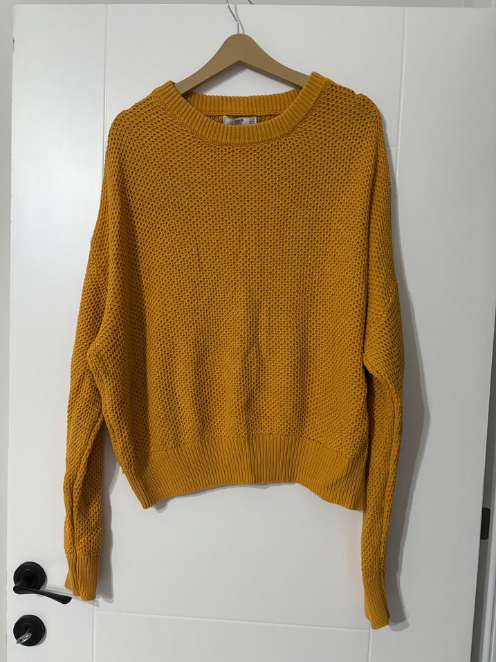 Sarı örgü, salaş kesim ve bisiklet yaka kazak. Uzun kollu, desensiz ve günlük kullanıma uygun rahat tasarım.