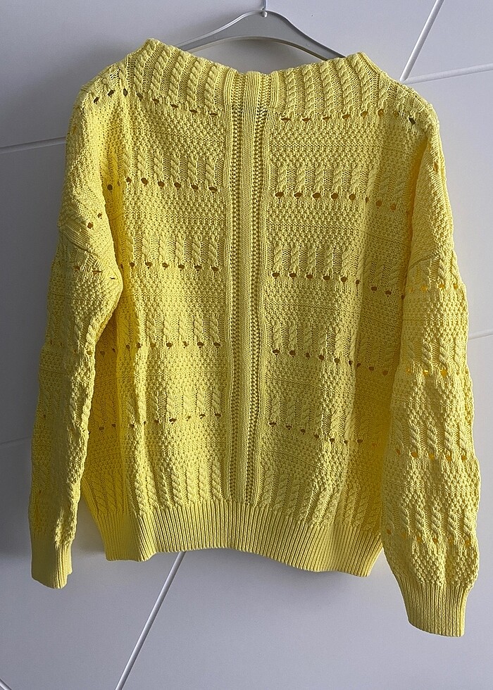 Bir kez kullanıldı çok hoş bir ürün hiçbir sorun yok yepyeni tüylenme yapmayan bir yapıya sahiptir orijinal mango markası oversize bir kazak boyu 64 iki kol arası 66 kol 54 cm S beden ancak 40 bedene kadar çok rahat olur