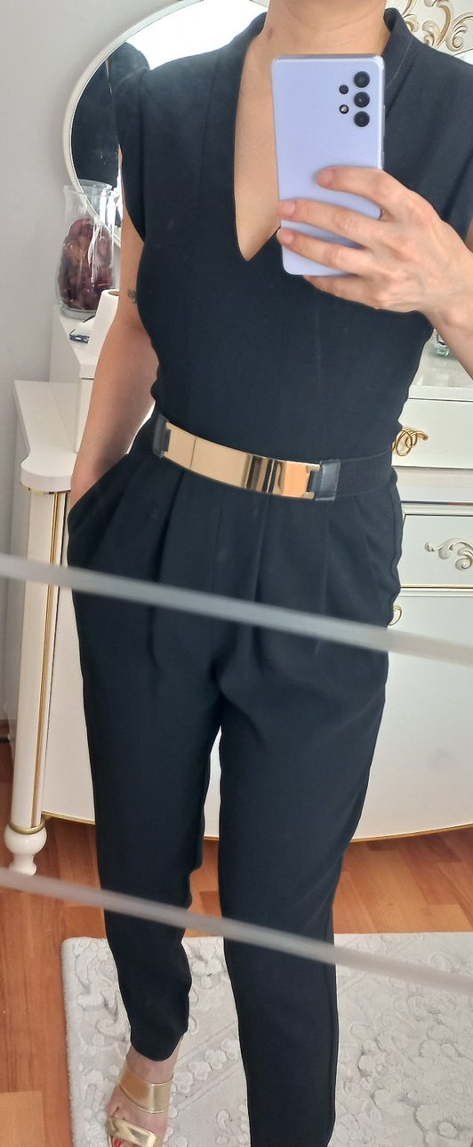 Kadın uzun tulum, kemerli ve koyu renkte ve iş ile sokak modasını birleştirir.✨S bedene de olur 52 kiloyum