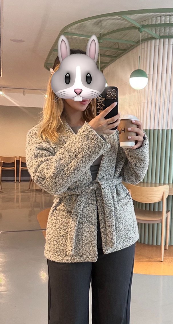 MANGO markalı, yünlü ve kemerli gri ceket. Uzun kollu, normal boyda, notched lapel yakalı, rahat kesim ve tie-dye desenlidir. s beden