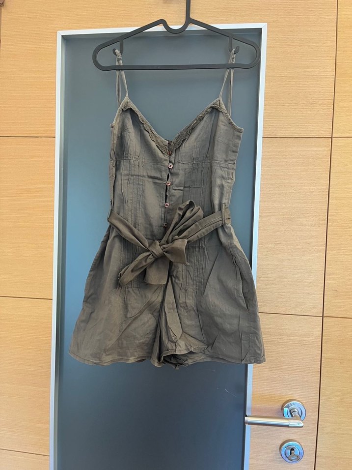 Yeşil keten kumaştan, kemerli ve askılı kısa şort tulum. Bohem vintage tarzıyla günlük kullanıma uygun.