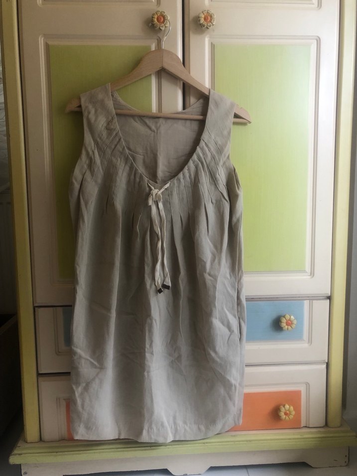 Keten kumaştan, kolsuz, V yakalı ve drapeli yazlık elbise. Bej renkte, rahat ve bol kesim, günlük kullanım için uygundur.