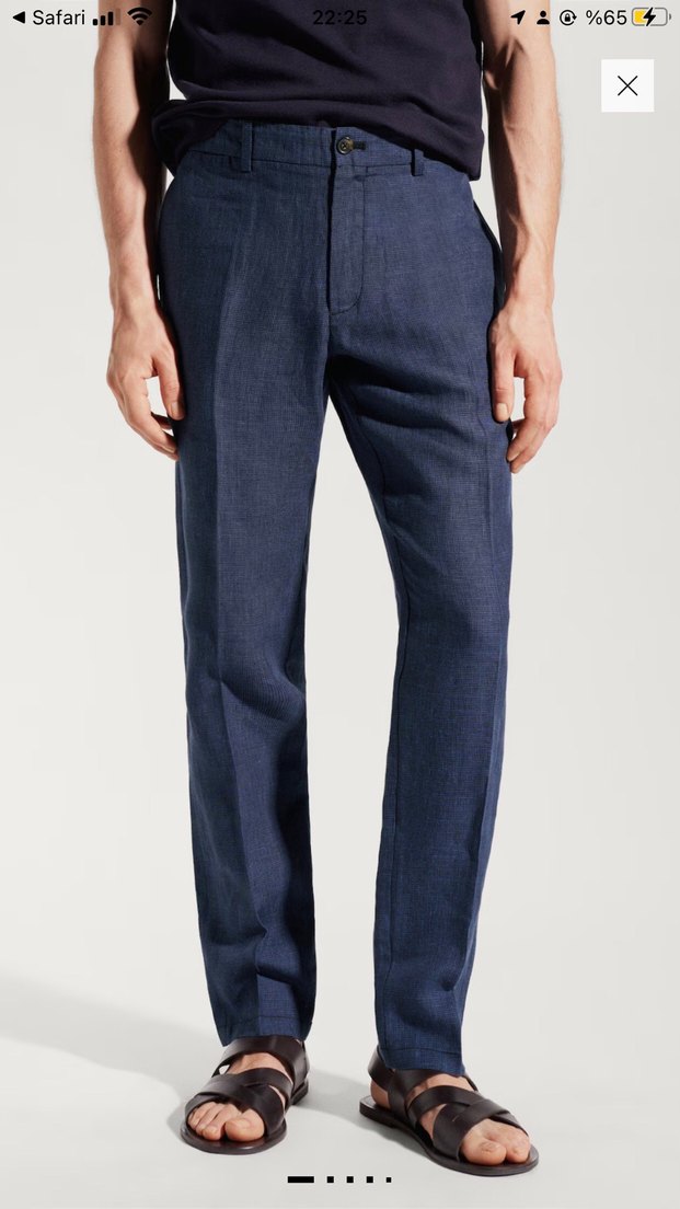 %100 keten. Dar kesim. Mikro yapılı apre. Mikro desenli. Yanları iki cepli. Çift düğmeli ve fermuarlı kapama. Kemer köprülü. Düz paça
