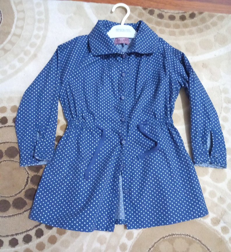 3-4 yaşa uygun MANGO KIDS marka gömlek model önden düğmeli şık elbise.Beli büzgülü ve bağlanabilir modeldir,yakası geniş yakadir.Kumaşı % pamukludur.Rengi resimlerde açık çıkmıştır.Normali Lacivert puantiyelidir.Elbisenin boyu 52 cm.dir.Çok sınırlı giyilmiştir.