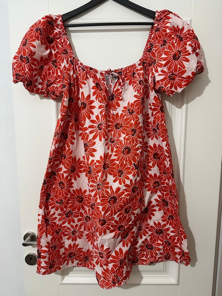 Kırmızı çiçek desenli, kısa kabarık kollu, volan detaylı bol kesim midi elbise. Yumuşak sentetik kumaştan, günlük kullanıma uygun.
