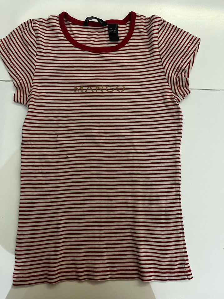 Dar kesim, kısa kollu kadın tişörtü, tekne yakalı ve kırmızı çizgili desene sahip. Yumuşak pamuk kumaştan, günlük rahat sokak stili için uygun. Mango marka, orijinal. Üzerinde minik 2 lekesi var
