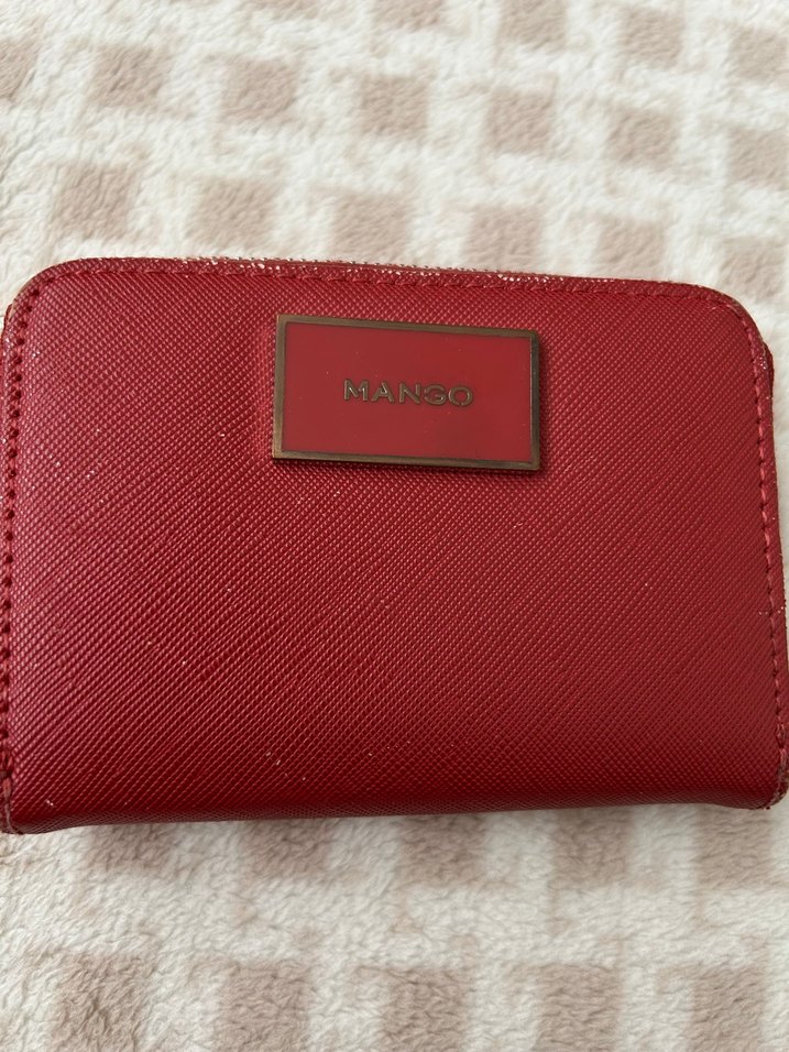 Mango markalı, parlak kırmızı sentetik kumaştan fermuarlı kadın cüzdan. Minimalist baskılı tasarım, günlük kullanım için uygundur. Ürün detayları görselde belirtilmiştir