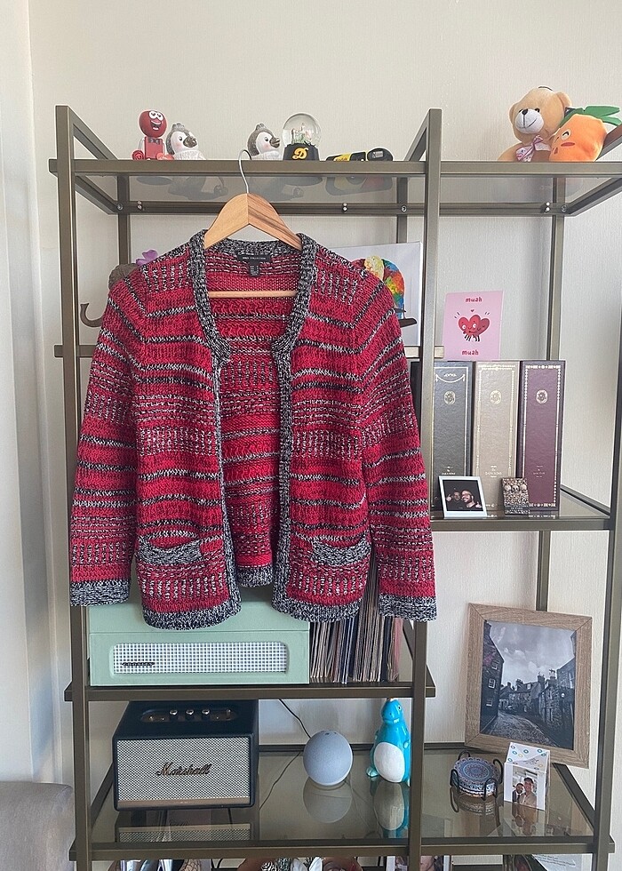 Mango collection marka M beden kırmızı siyah detaylı kalın tok kumaşlı hırka. Cep detaylı vardır ve hiçbir defosu yoktur.